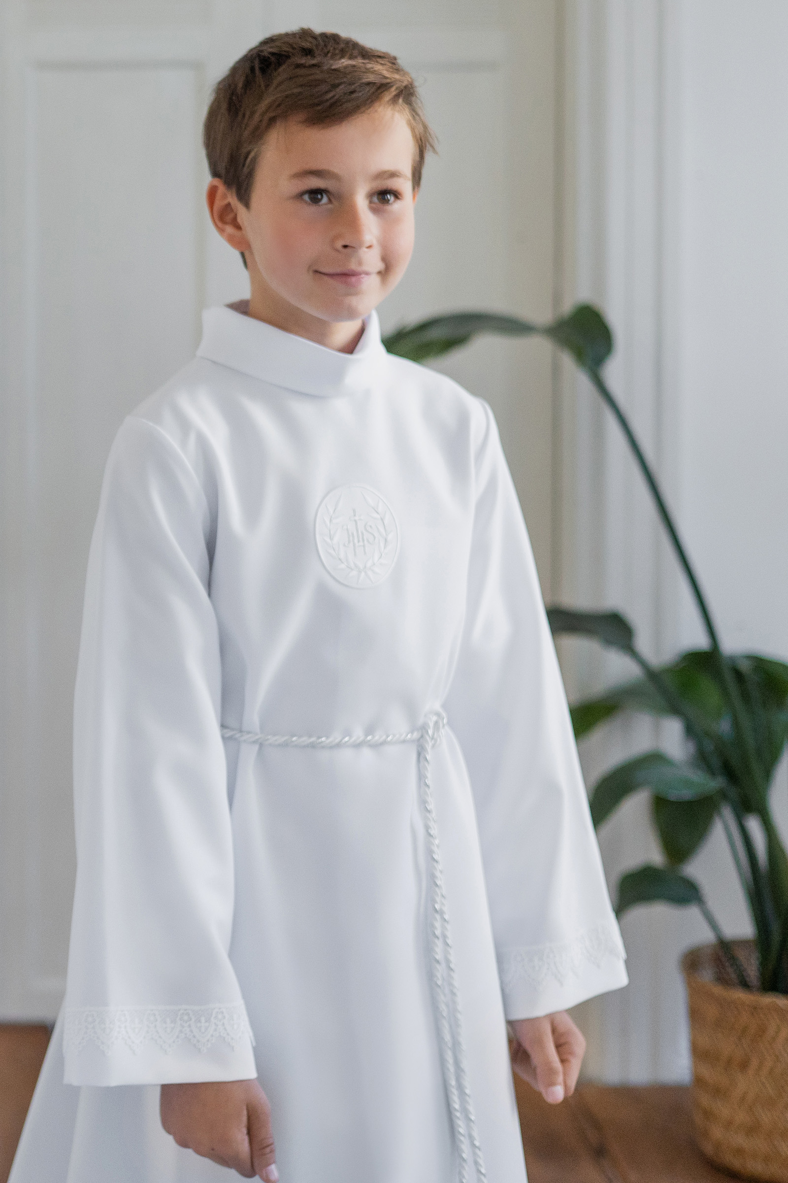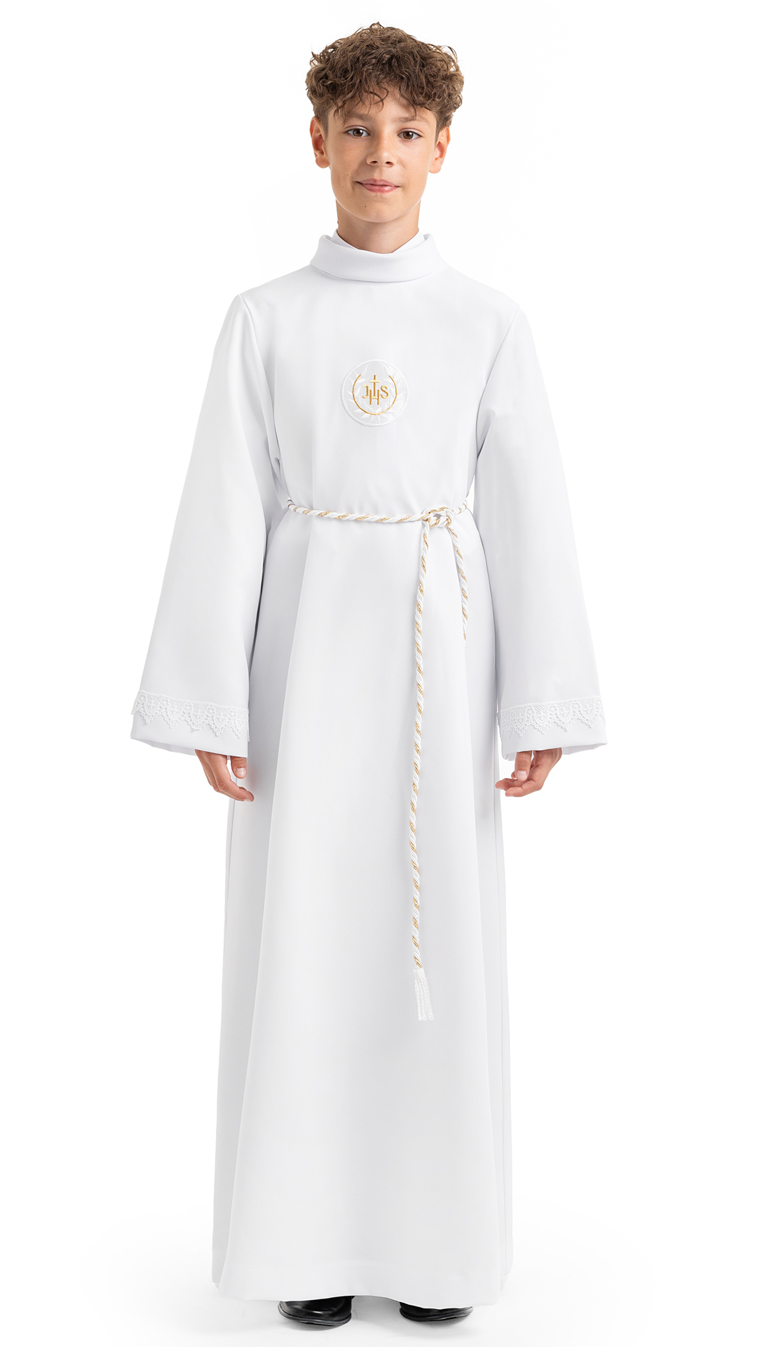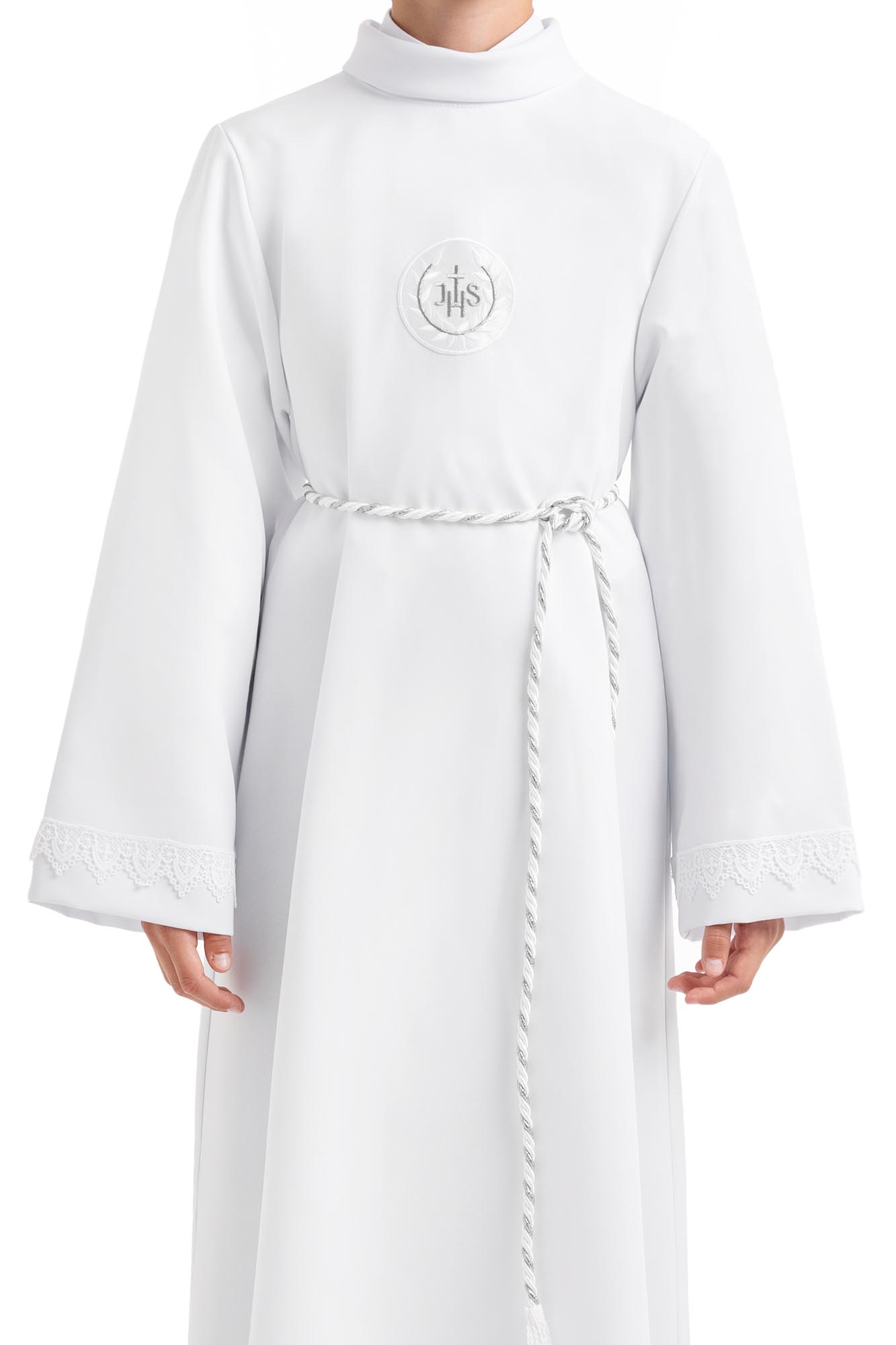 Klasyczna alba o prostym kroju zdobiona koronką na rękawach. W zestawie sznur do przewiązania alby w pasie.